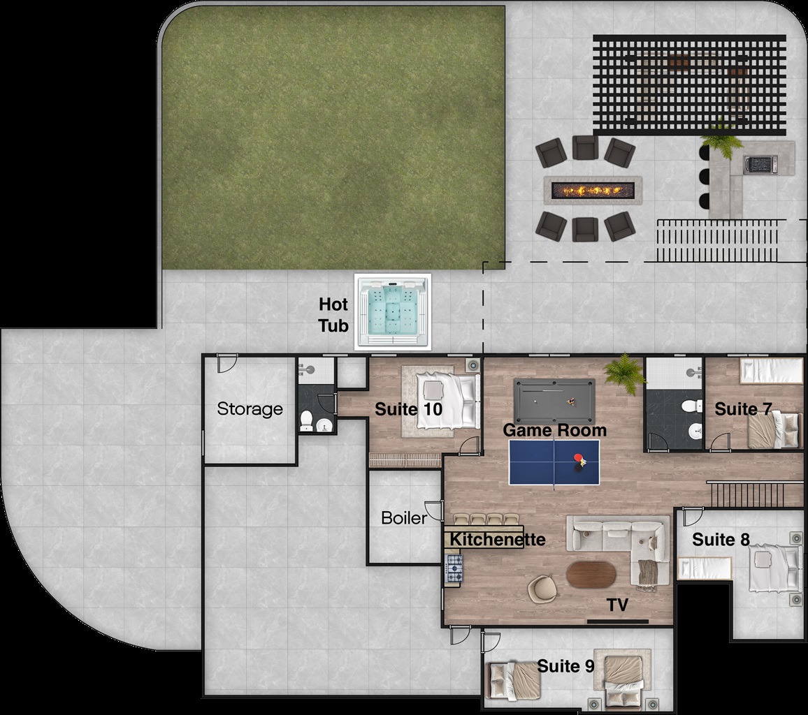 Entertainment Zone – Features a wet bar, billiards table, and theater room with surround sound.