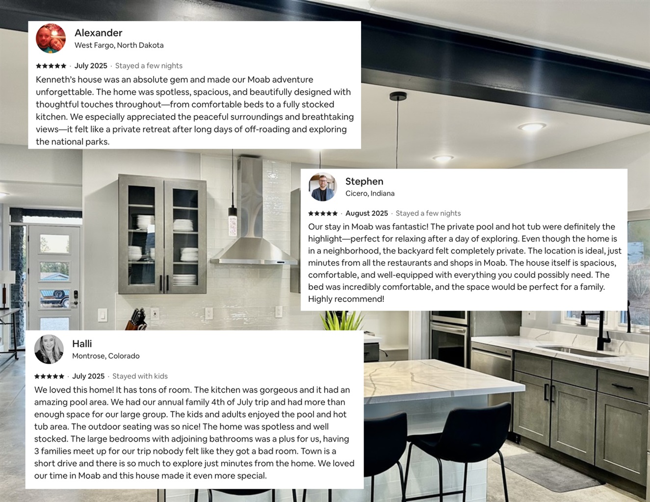 Exclusive Retreats is a family-run luxury rental company with 11 premier properties in Moab and 4 in Costa Rica. With over 15 years of expertise, we specialize in purpose-built vacation homes designed for comfort, adventure, and connection. Because we personally own and manage every property, guests enjoy the highest standards of quality, seamless service, and the personal care only a family business can provide.