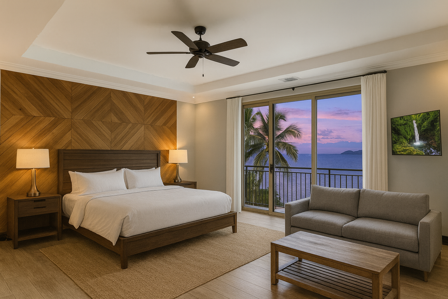 • Suite 2 (Family Suite): King bed, queen sofa bed, attached bunk room (4 twins), en-suite bath, Smart TV, private patio. Bunk room can be closed off to create an elegant private king suite.